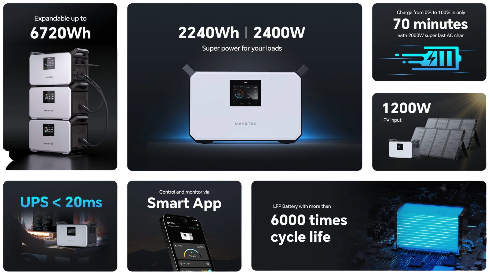 MARSTEK utilise des cellules LiFePO₄ offrant plus de 6000 cycles de charge, garantissant plus d’une décennie d’utilisation fiable. Grâce à une conception résistante au feu et aux explosions, elle assure une alimentation durable et sûre pour une tranquillité d’esprit totale.